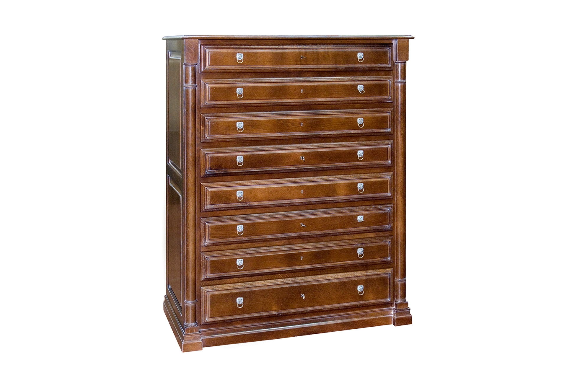 The Belvoir Gun Cabinet is shown in Oak wood with a Classic finish and features a total of 8 drawers - 7 thin drawers of equal size and 1 larger drawer at the bottom. The interior of the drawers is upholstered in red suede.