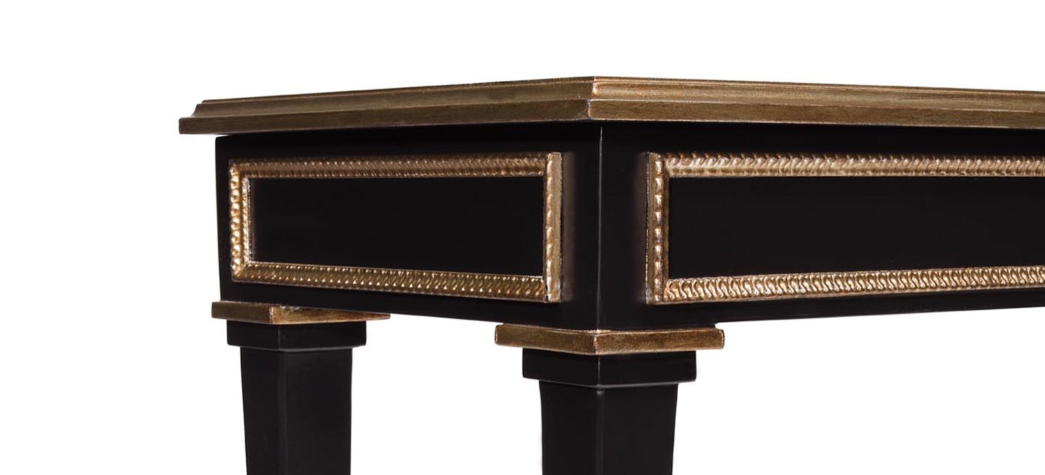 Entirely handmade in French Cherry wood with a Pure Black finish and Gold Leaf details, the Alfred console table is available in a range of sizes. Shown with sabots in Antique Brass.