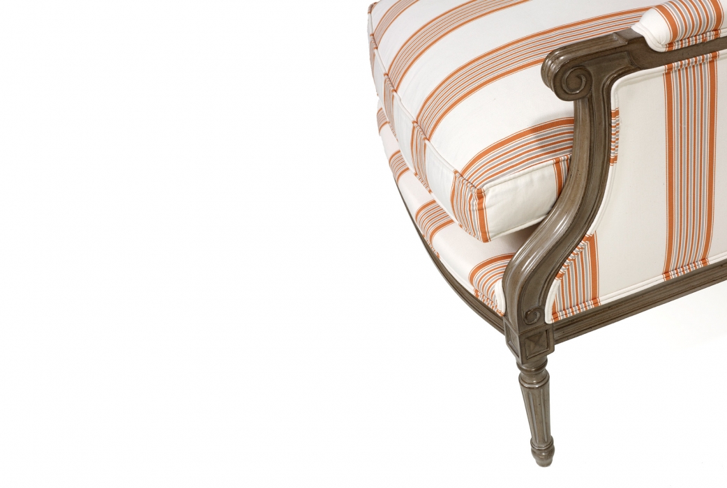 The Louis XVI Bergère is shown in Cherry wood with an Antique Grey finish. Note the fluted en carquois legs and the rectangular à la reine back.